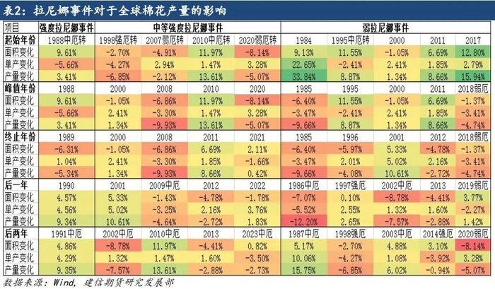 拉尼娜对我国棉花产量影响以提升为主,同时随着拉尼娜从开始到结束这种提振效果逐渐减弱。而在厄尔尼诺和拉尼娜互现转换的年份产量变化并没有明显的倾向性。