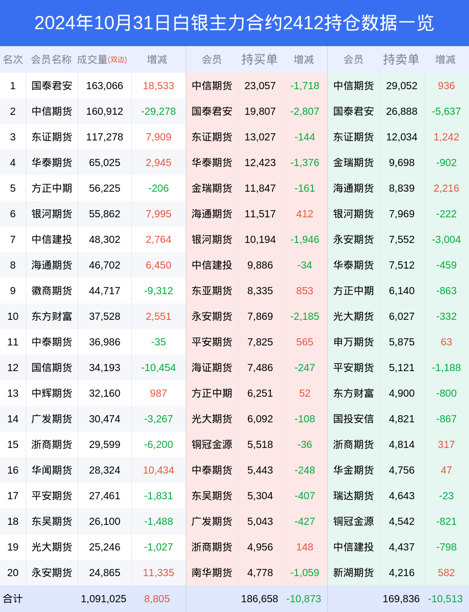 新浪期货 根据交易所数据,截至10月31日收盘主力合约白银2412,涨跌-2.13%,成交量88.97万手,持仓数据显示前20席位呈现净多,差额头寸为16822手。