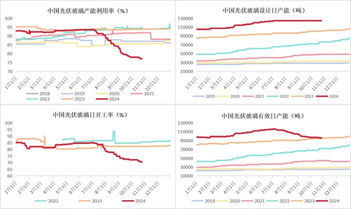 截至2024年10月24日,全国光伏玻璃总窑炉座数153座,共计产线607条,其中在产窑炉110 座,在产产线共计481条,冷修窑炉43座,光伏玻璃企业开工率为70.65%,产能利用率为77.10%。