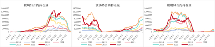 截至2024年10月25日,FG01M持仓量本周小幅增长,持仓量为1108426手,较10月18日增加13079手(环比+1.19%),较去年同期+219406手(同比+24.68%);FG05M本周持仓量增加显著,持仓量为259812手,较10月18日增加34824手(环比+15.48%),较去年同期-73710手(同比-22.1%);FG09M本周持仓量大幅增加,持仓量为16823手,较10月18日增加4898手(环比+41.07%),较去年同期-4557手(同比-21.31%)。