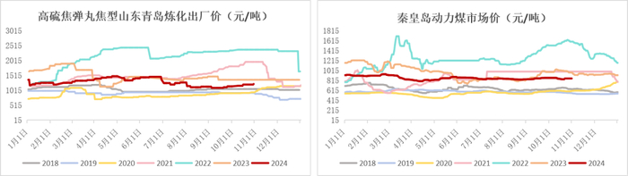 截至2024年10月25日,高硫焦弹丸焦型山东青岛炼化出厂价为1210元/吨,较去年同期-160元/吨(同比-11.68%);秦皇岛动力煤市场价格为855元/吨,较上周+15元/吨(环比+1.79%),较去年同期-119元/吨(同比+12.22%)。