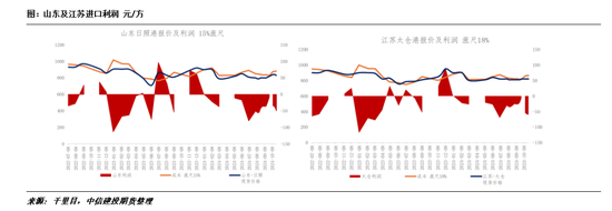 国内外检尺的差异是国内的贸易商主要的利润来源之一,新西兰使用的是JAS标准,即小头短径;但是国内北方的标准为国标标准,小头的平均直径,意味着天然存在近10%的涨尺(但不同规格涨尺幅度有差距,口径大涨尺幅度小,口径小涨尺幅度大)。另外,山东、江苏主要的港口贸易商会根据进口利润情况,在10%的基础上继续增加一定幅度,一般情况下总涨尺幅度在15%-20%左右。目前由于市场需求疲软,进口利润处于负值水平。
