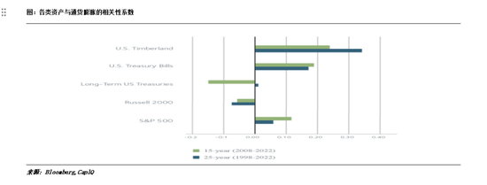 在通货紧缩或低通胀期间,林业与CPI的年度相关性通常会下降或变为负值。生物生长作为一个与经济完全无关的物理过程,在低通胀环境中占林地回报的比例更高。