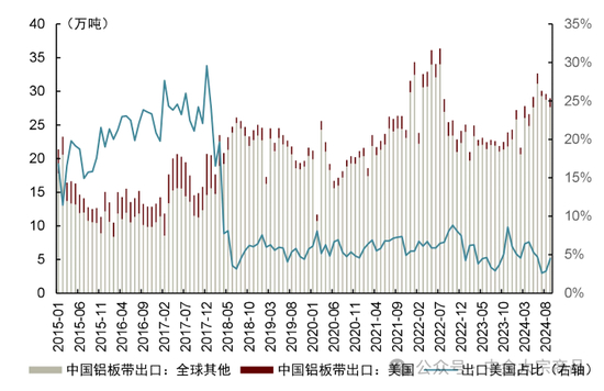特朗普重返白宫对于有色金属的影响较为复杂,利空在于关税上调、新能源补贴削减,而利多在于基建与制造业投资加码、对内减税推升通胀。虽然我国有色金属及成材对美直接出口的总量和占比均十分有限,例如铜材、铝材出口美国数量占比均不足5%。然而,截至2023年,美国占我国机电产品出口总额的15%,加征关税或间接影响国内对应领域的有色金属需求。此外,特朗普政府可能取消对新能源车的补贴,我们预计补贴的退坡或对美国新能源车需求产生压力。