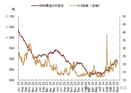 大选当天国际黄金价格有所回落,我们认为或受到短期避险情绪缓解和宽松预期弱化的综合影响。往前看,我们认为特朗普的对外政策可能在一定程度上缓解全球地缘政治风险,但同时其对外的关税政策也可能加剧国际贸易摩擦,对于黄金避险价值的影响或一体两面。对于黄金的投机价值,我们认为特朗普减税和财政刺激政策可能为美国带来再通胀风险,打压市场降息预期,为正处于历史较高水平的COMEX黄金期货投机净多头带来一定的出清风险。可以看到,大选当天黄金价格回落的同时,美债10年期名义利率和实际利率分别抬升至4.4%和2%上方。相较之下,我们认为除非2021-23年的恶性通胀再现,美国通胀反弹或不会成为金价中枢的核心驱动因素。