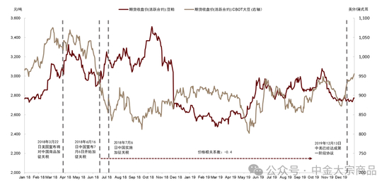 图表:CBOT大豆期货价格与DCE豆粕期货价格走势(2018.1.1-2019.12.31)[3]