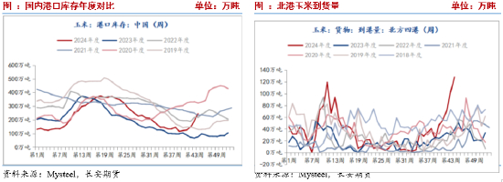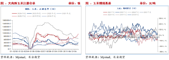 受集中收获、上量压力,全国范围内现货价格偏弱运行,需求端随采随用提振作用暂时有限。多投资者寻求期货平台套保缓解现货压力,近期仓单压力迅速增加。截至2024年11月8日,交易所玉米期货注册仓单76936张,环比增加6520手,从季节性来看,玉米注册仓单位于历史较高水平。大幅增长的仓单数量带来不容忽视的仓单压力。而基差走弱背景之下,也将为套保提供良好的时机,因此短期上涨空间有限。