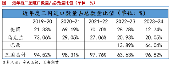 特朗普赢得大选,可能会兑现前期承诺,将对从中国进口的商品征收高达60%的关税甚至更高。而如果贸易战升级,中国必将采取对等的反制措施,而提高美国农产品进口关税则是主要的反制措施之一,特别是大豆和玉米。而大选后对贸易格局的影响,可能会导致美国玉米价格下降,而巴西和阿根廷等国的玉米价格上涨,我国玉米价格平均也会上涨。但2018年中美贸易战之后我国贸易格局快速调整,进口美玉米比重大幅降低,影响比重较2018年大幅降低,因此贸易战对于玉米影响有限,玉米将更多的跟随商品起伏涨跌。