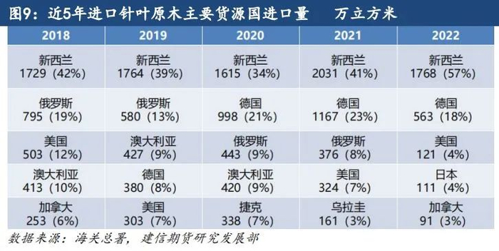 从针叶原木进口市场来看,我国针叶原木进口占原木总进口量的71%,针叶原木进口占我国针叶表观消费量的57%,进口来源国较为集中。新西兰是我国最大的针叶木供应国,我国新西兰进口针叶原木占比为57%,德国占比为18%,美国占比为4%,日本占比为4%,加拿大占比为3%,排名前5进口国合计占比为86%。
