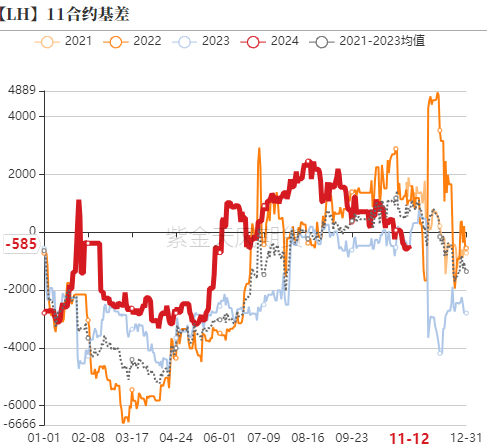 截止到11月13日,2411合约基差为-585,在交割月2411合约出现明显的升水,主要是11月下旬气温下降,终端需求环比逐步增加,加上南方腌腊灌肠启动,市场对现货价格相对乐观。
