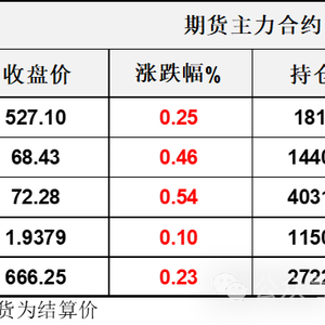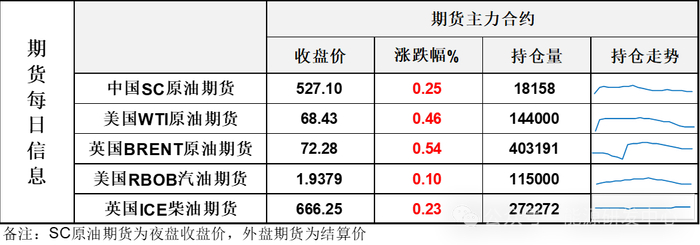 【1】WTI主力原油期货收涨0.31美元,涨幅0.46%,报68.43美元/桶;布伦特主力原油期货收涨0.39美元,涨幅0.54%,报72.28美元/桶;INE原油期货收涨0.25%,报527.1元。