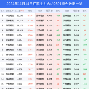 新浪期货 根据交易所数据,截至11月14日收盘主力合约红枣2501,涨跌-2.29%,成交量11.71万手,持仓数据显示前20席位呈现净空,差额头寸为13932手。