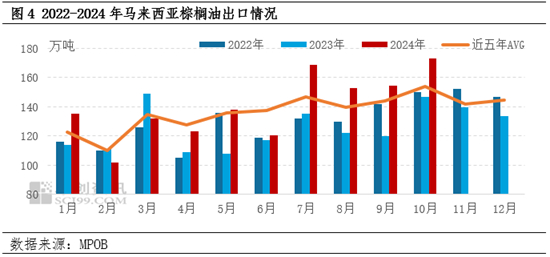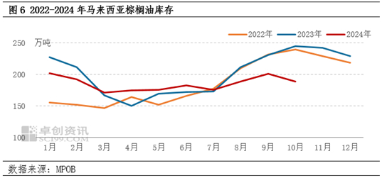 10月马棕产量环比下滑,对价格存在利多支撑。MPOB数据显示,10月马来西亚棕榈油产量环比降1.35%至179.73万吨,同比降7.22%。据此前路透预估数据,2024年10月马棕产量下滑至176万吨,产量略高于预期值,但在增产周期下,马棕产量维持下降趋势,导致市场对于供应偏紧预期仍存。分地区来看,10月棕榈油产量仅沙巴出现增长,产量为43.48万吨,环比增10.30%;马来半岛棕榈油产量降幅最为明显,环比降5.42%至96.88万吨;沙拉越产量环比降2.40%至39.37万吨。2024年马棕同比维持增产趋势,1-10月马棕累计产量为1623万吨,同比增101万吨或6.64%。但马来棕榈油提前进入减产周期,8月产量为年内高点,9-10月产量出现反季节性下滑,在即将到来的减产周期下,市场对于未来供应仍存在偏紧预期,支撑棕榈油价格。