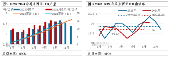 10月马来西亚CPO整体出油率为20.03%,环比上月下滑0.04个百分点,同比降0.31个百分点。分地区看,主要地区CPO出油率增减不一,马来西亚半岛、沙巴、沙拉越CPO出油率分别为19.95%、20.91%、19.31%,其中仅马来半岛出油率增加0.1个百分点,沙拉越出油率降幅最大为0.34个百分点。全年水平上来看,2024年1-10月平均出油率为19.68%,同比下滑0.16个百分点。马棕棕榈果串单产及出油率存在高位回落趋势,导致10月产量下滑,同时对于11月马棕产量或存在抑制,利多价格。