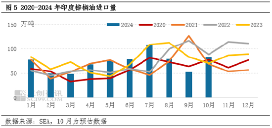 印度作为棕榈油第一大进口国,10月进口量明显增加,提振棕榈油价格上行。9月印度对棕榈油进口量偏低,但10月底排灯节对棕榈油需求量预期增加,10月印度为补充本国库存,提高棕榈油进口量。据市场人士预估,10月印度棕榈油进口量或达到84万吨,环比增加59%,1-10月累计进口量为725万吨,同比减少29万吨,降幅3.85%。