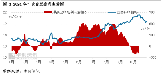 前期能繁母猪存栏持续从高位下滑,叠加2023年四季度猪病强化产能去化预期,业者对猪价上涨预期升高,2024年从各维度来看,二次育肥客户补栏空间皆有较为明显提升,且养殖盈利丰厚。一方面,河北、山东、河南等区域去产能预期兑现猪价上涨现实,在春节阶段提前显现,养户拥有较长的补栏规划窗口期,可选择时间空间增多且可自由选择长短线不同育肥方式。另一方面,非瘟疫情回归平稳,育肥中小猪风险降低,二育凭借育肥阶段高增重效率特点,稳定赚取料肉比,叠加全阶段饲料成本下滑,年内可选择补栏体重更加多元化。最后,长期亏损叠加猪病不确定性,中小散户更多的选择二次育肥实现降低亏损风险,二育群体规模得以扩大,加之5月以来猪价节节攀升至高位,盈利大幅度上涨刺激年内二育补栏体量随之提升。综合来看,在明确上涨周期以及成本下滑的主基调下,2024年二次育肥养殖模式快速发展,盈利也随之扩大。根据补栏体重标准为115公斤的生猪,育肥至150公斤出栏,2024年1-10月生猪二次育肥理论盈利均值为191.35元/头,年内盈利最高点为6月12日的611.42元/头。