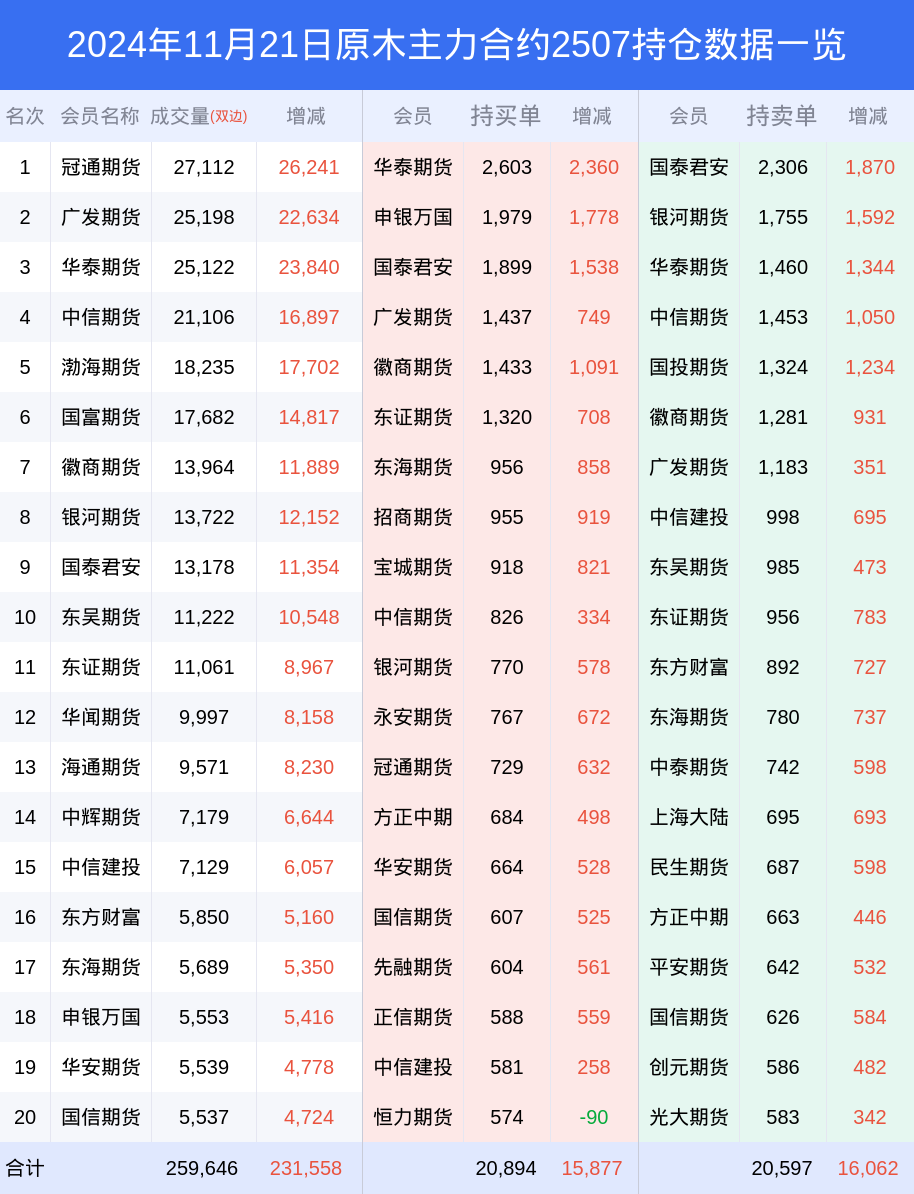 新浪期货 根据交易所数据,截至11月21日收盘主力合约原木2507,涨跌+5.99%,成交量20.17万手,持仓数据显示前20席位呈现净多,差额头寸为297手。