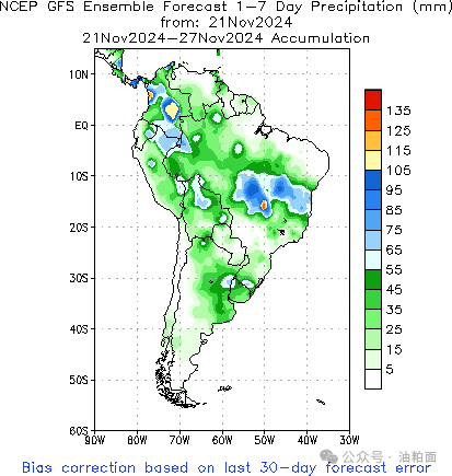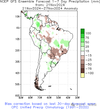 南美主产区未来1-7天降水及距平