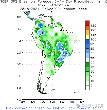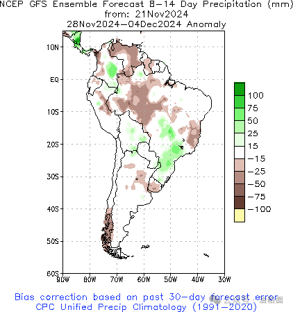 南美主产区未来8-14天降水及距平