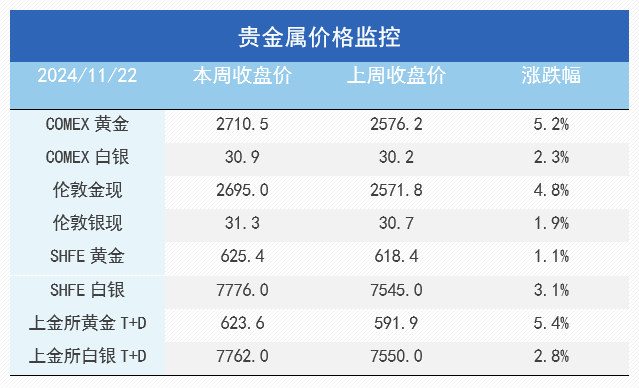 上周COMEX金价持续反弹、银价窄幅震荡,COMEX金银于2568-2719美元/盎司、30.3-31.7美元/盎司区间内运行。上周美国经济数据表现依然强劲,12月降息概率大幅降低,美元持续走强,而俄乌冲突的再度升级推升市场避险需求,金价由此触底反弹至2700美元/盎司上方。