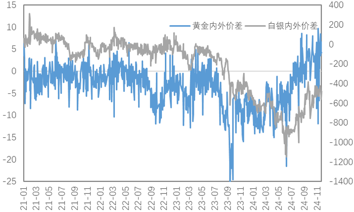 近期人民币汇率影响较前期走弱,上周黄金白银内外价差有所回落;内外比价有所回升。