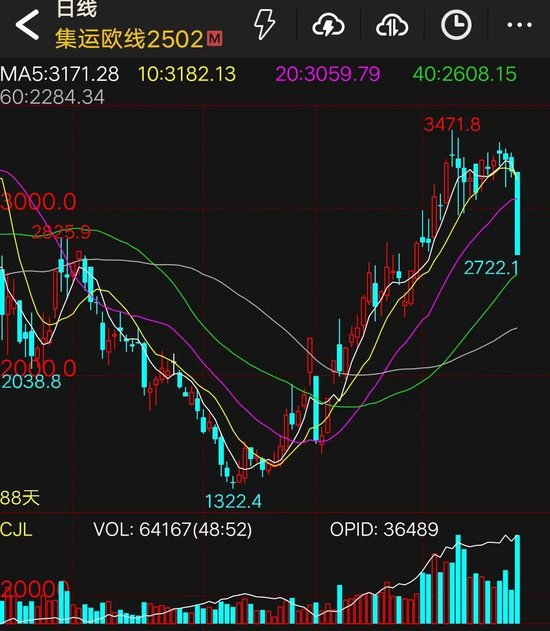 周一,集运指数(欧线)期货价格大跌。截至收盘,集运指数(欧线)期货主力合约2502跌停,跌幅达16%,报收于2722.1点。
