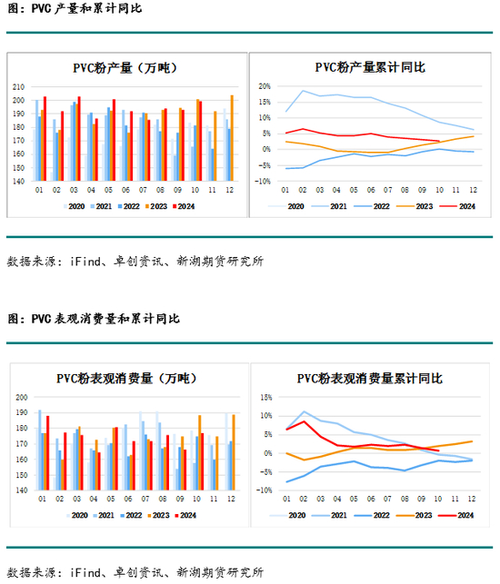 8月至10月受检修逐渐结束及BIS政策延期的影响,PVC产量和出口量均有提升,10月PVC产量199.45万吨,净出口22.34万吨,表观消费量177.11万吨,表需累计同比0.62%。