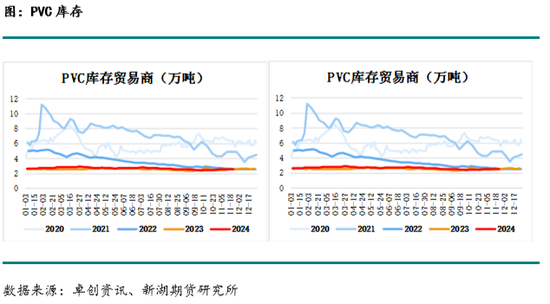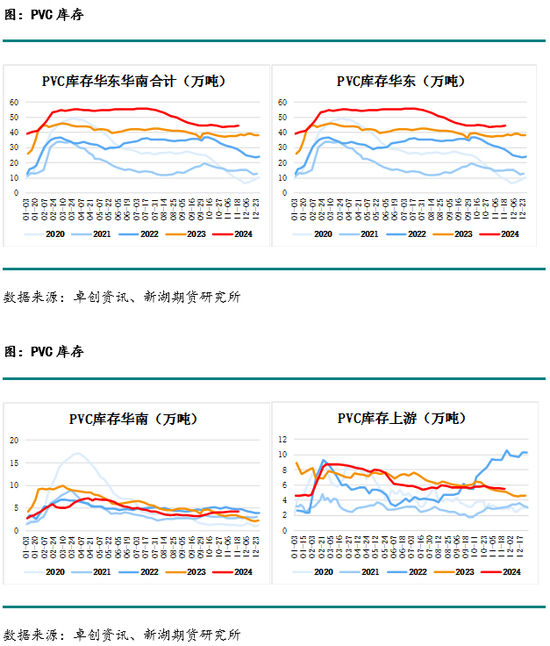 2023年初PVC库存在25.73万吨的高位,较往年年初库存水平高10万吨以上,且春节期间累库速度较快,春节后累库至40万吨以上的水平,之后几乎保持这一水平至年末。今年年初PVC库存在40万吨所有的水平,往年同期在15万吨,去年库存水平在24万吨,今年年初库存水平大幅高于往年和去年,而1月继续小幅累库至41.27万吨,春节假期前未能去库。