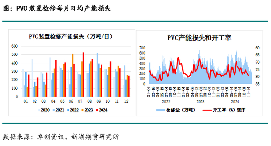 PVC利润持续走低,10月至11月电石价格从低位2600元小幅回升至2800元,而PVC价格持续走低,华北外购电石的PVC利润从580元大幅下降至-320元,处于往年同期中间偏低水平,对PVC开工影响暂时有限。10月中旬后PVC检修产能损失持续下降,开工随之持续提升,PVC开工率从10月底的75%提升至11月下旬79%,产量维持在往年同期最高水平附近。
