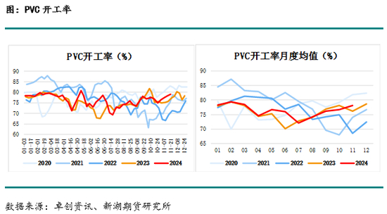 10月中旬后PVC检修产能损失持续下降,从最高日均检修产能损失530万吨持续下降至11月下旬的250万吨,开工随之持续提升,PVC开工率从10月底的75%提升至11月下旬79%,产量维持在往年同期最高水平附近。