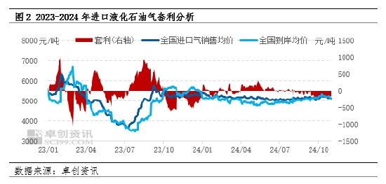11月中国LPG进口套利空间依旧关闭,截至11月27日,本期卓创资讯理论测算进口套利平均为-142元/吨。本期全国进口气外售均价为5120元/吨,较上期价格跌62元/吨,跌幅为1.2%。国际方面,沙特阿美公司11月CP丙丁烷较10月上调,其中丙烷635美元/吨,丁烷630美元/吨,折合进口到岸成本(不含码头操作费)在5300元/吨左右,11月CP略高于市场预期,进口到岸成本较10月上移。国内方面,11月国内进口到港量处于偏低水平,但国内部分主营炼厂民用气外放量增加,对进口市场形成冲击,同时终端需求改善不及预期,国内进口市场整体呈现横盘整理态势,进口套利空间已连续四个月维持关闭。