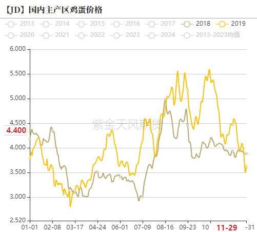 • 2019年是鸡蛋惊心动魄的一年,1月初因春节前中秋备货,现货价格有短暂反弹,1月中旬之后现货开始高位快速回落,到3月上旬,现货价格跌破3元关口。随后需求端逐步回暖,现货价格进入快速反弹阶段,一直到5月中旬现货价格逼近4.5元关口,随后快速下跌到6月中旬现货价格跌至3.5元关口。3月之后的上涨,除了季节性需求回暖提振现货价格外,也跟生猪价格快速上涨,鸡蛋替代需求以及投机需求增加有关,而5月之后的下跌主要是因生猪价格上涨带来的看涨情绪,刺激囤货商囤货热度较高,端午节备货结束加上梅雨时节囤货难度增加,因此贸易端集中抛货,现货价格快速回调。而期货端二季度合约上涨启动时间要早于现货,从2月底期货价格开始快速反弹。