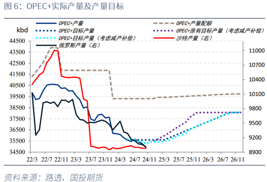 因此从12月5日第38届OPEC+部长级会议的最新政策来看,在原有OPEC+产量配额及2023年4月会议中提出的165.7万桶/天超额自愿减产被进一步延续至2026年底的前提下,沙特、俄罗斯等8个自愿减产国第3次将退出2023年11月会议提出的216.4万桶/天超额自愿减产的时间点推迟,会议决定该部分自愿减产由原定的自2025年1月起一年内完成退出调整为自2025年4月起分18个月完成退出,增产节奏也将更加平缓。