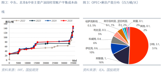 从中东、北非主要产油国最新的经常账户平衡所需油价来看,受石油减产政策及与投资相关的进口需求增加影响,2022年以来其成本曲线明显抬升,90%分位边际成本已由2022年伊拉克的64.2美元/桶上移至今明两年的85美元/桶左右,边际供应者由沙特、伊拉克主导。而从OPEC+剩余产能的分布来看,85%的潜在增产能力集中在沙特、阿联酋、伊拉克和科威特4国,特别是沙特310万桶/天的闲置产能占比已达51%,因此这一核心团体的产量政策对OPEC+的未来供应更具现实意义。