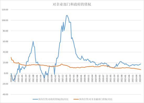 924新政后央行创设了针对股市的互换和再贷款,这是相当于股市的PSL工具,为股市直接提供资金兜底,是最重磅的金融刺激政策。首期8000亿,后期可以通过央行的资产负债表来观察落地情况。10月份可以观察到央行的其他金融部门的债权同比增速快速回升,而对非金融部门的债权仍在下行当中,对政府的债权处于稳定状态,M2与社融增速也出现明显背离,实体经济需要类似对股市那样无限托底的强心针。