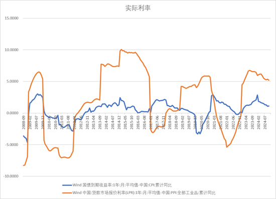 实际利率才是影响宏观经济,影响企业和居民部门投资消费的关键因素之一。以一年期国债利率与CPI的差值反映居民部门的实际利率,以一年期LPR利率与PPI差值反映企业部门的实际利率,在中国降息的政策下,两者当前有下行的趋势,但目前水平仍处于中性偏高的水平。政策还需进一步加力。实际利率较高的核心原因是出现明显的通缩迹象。