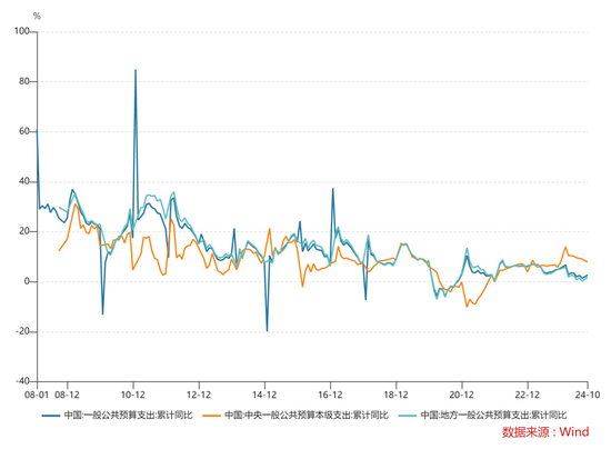截至2024年10月中国财政一般公共预算支出累计增速2.7%,处于历史上偏低的区间,中央支出增速7.8%,明显大于地方支出增速的1.8%,地方债务压力较大,只有靠中央多增。但是即使如此,中央预算支出仍处于历史中性水平。