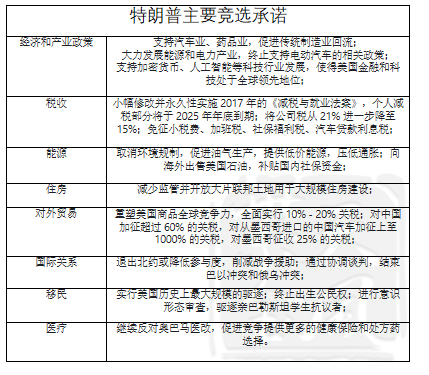 特朗普在 2016 年美国大选中以 “让美国再次伟大” 和 “美国优先” 作为主要竞选口号,提出了包括大规模减税、重振制造业、打击非法移民、重新谈判贸易协定以及增加军费等诸多口号。