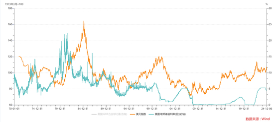 美联储降息周期与美元关系密切,除了上世纪70年代滞涨时期美联储利率周期与美元反向,多数时期美联储利率周期与美元指数同向。