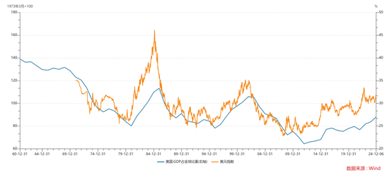 全球化和逆全球化主要反映在资本流向美国还是流出美国,与美元大周期呈现一致性的因果关系。美国GDP占比是全球化大周期的定量衡量。美国GDP占比提升意味着美国资产回报率的提高,资本流向美国,美元升值。