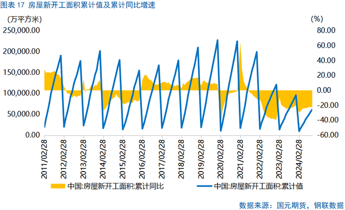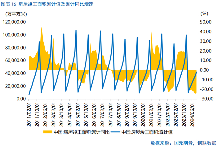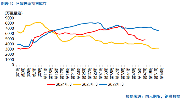 房地产竣工端为浮法玻璃的最大下游,2024年,受制于房地产竣工端表现不佳,浮法玻璃消费表现较弱。据钢联数据统计,用于建筑的玻璃占玻璃下游消费的88%。2024年1-10月,中国房屋竣工面积累计值在41995.15万平方米,累计同比下跌23.9%。房地产新开工至竣工期间需要经历约24-36个月,2022年,房屋新开工面积降幅达到39.4%,意味着2025年房屋竣工表现承压,浮法玻璃需求或延续下行。同时,影响浮法玻璃需求的还有房地产相关政策,尤其是针对于竣工相关的政策,2025年一季度末,国内重要会议所出台的相关政策值得密切留意,其可能会对浮法玻璃市场产生提振。