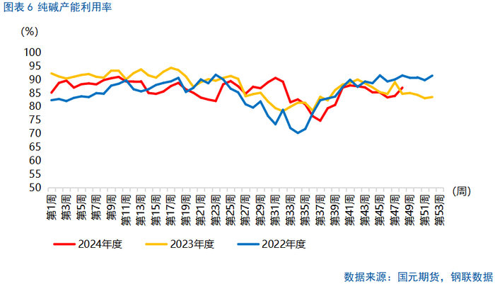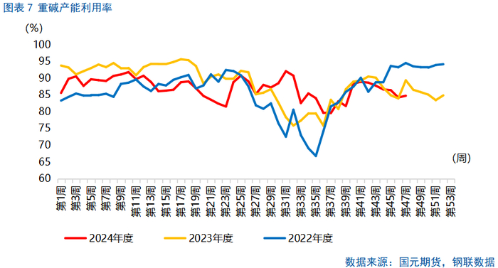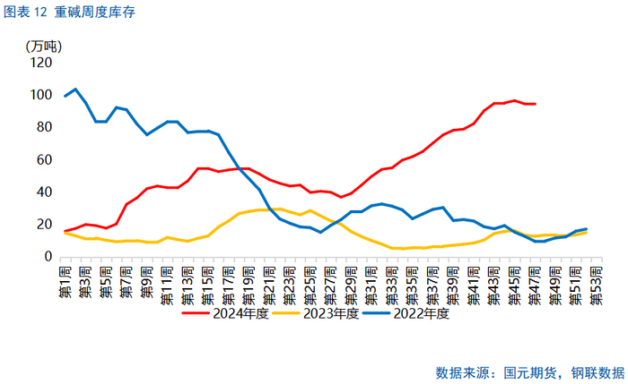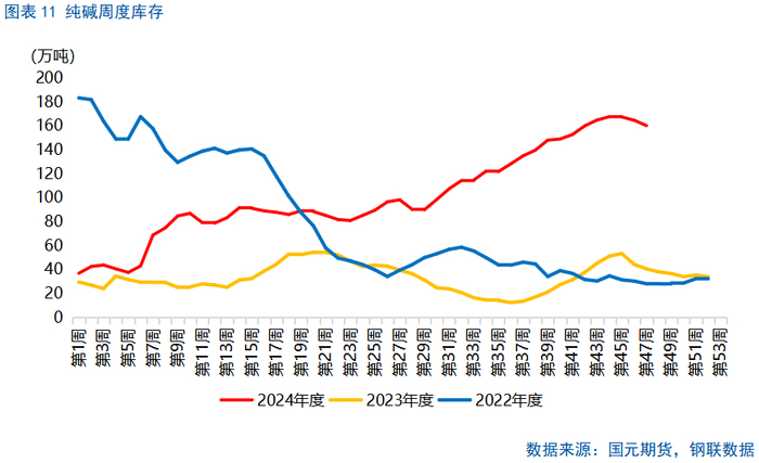 2024年,纯碱延续供过于求格局,库存大幅积累。2024年1至11月,纯碱厂内库存持续上涨,自1月初的39.96万吨大幅上涨至11月的160.31万吨,涨幅超过三倍。步入2025年,考虑到2024年四季度及2025年均预计有新增产能的投产,纯碱总库存将维持上涨,但过程中存在波动。纯碱新装置若顺利投产,其产量在2025年一季度释放,纯碱库存压力提高,此外,若特定事件发生,如:纯碱装置因夏季检修而大幅减少供应、“金九银十”季节性旺季下游需求阶段性补库等,则纯碱库存将会有阶段性下行,但整体难改累库格局。
