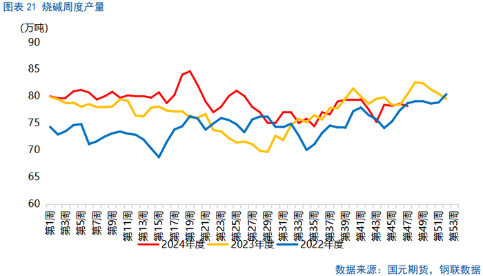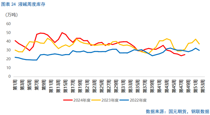 2025年,预计非铝需求下游终端涉及纺织服饰消费等行情,其出口依赖度约为二成,随着美国关税政策落地,海外消费韧性降低,将一定程度上对非铝需求增速形成拖累。但是,随着进口铝土矿数量增长,氧化铝持续投产,国内铝土矿需求将增加,对于配比使用的烧碱需求也将有所增加,烧碱最大下游氧化铝需求有望提升。综合来看,步入2025年,烧碱需求整体仍然向好,液碱库存有望维持在偏低水平。