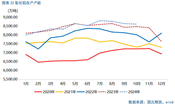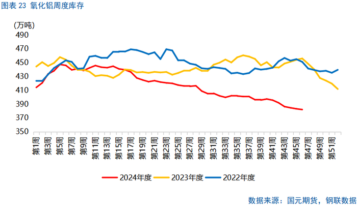 据中国海关总署,2024年1-10月,中国累计进口铝土矿13174万吨,同比增加12.0%。分国别看,自几内亚进口铝土矿9209万吨,占进口总量的69.9%,同比增加11.1%;自澳大利亚进口铝土矿3300万吨,占进口总量的25.05%,同比增加18.34%;非主流进口铝土矿总量665.3万吨,占进口总量的5.05%,较2023年同期非主流铝土矿进口总量(不含印尼进口矿)增加33.8%。非铝需求方面,印染行业对烧碱需求同比增加。根据国家统计局数据,2024年1-9月,印染行业规模以上企业印染布产量416.22亿米,同比增长2.94%,不过增速较上半年回落1.04个百分点。截至11月,液碱场内库存在24.95万吨,较年初下滑38.83%,同比下滑19%。