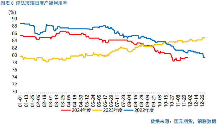 2024年1-10月,浮法玻璃年内累计产量已经达到5197.75万吨,同比上涨4.46%。截至11月底,浮法玻璃日平均产能利用率达到83.7%,同比增加了2.47个百分点,其中供应的增加主要源于一季度。在上文我们提到过,2024年3月末至11月下旬,浮法玻璃产能利用率大幅下跌7.2个百分点。实际上,当时浮法玻璃库存大幅上升,同时利润也持续压缩,据统计,煤制浮法玻璃利润大幅下跌116元/吨,跌幅达到30%,这种产业链的低迷态势促使浮法玻璃企业纷纷采取堵窑口等措施以降低产量,致使部分产线产能被淘汰。