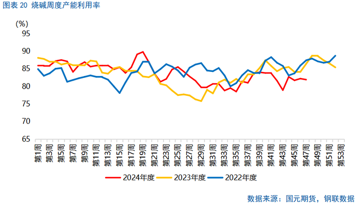 根据钢联数据,2024年1-10月,烧碱累计产量达到 3443.68 万吨,较去年同期增加 136.73 万吨,累计同比增加 4.14%。2024年11月-12月,烧碱存在少量新增产能,但对产量影响不大,预估2024年烧碱全年产量超过4100万吨,创下2019年以来的新高。步入2025年,预计烧碱新增产能达到200万吨,若全部顺利落地,产能增速将达到近5%。