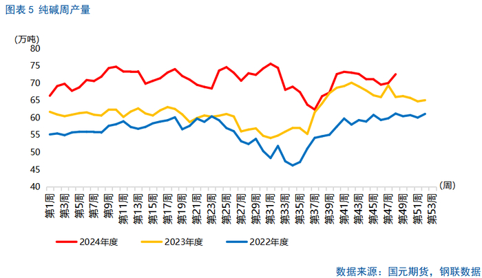 2024年,纯碱价格中枢下行。2024年1月-2024年3月,在纯碱新装置投产预期以及下游拿货相对一般的背景下,碱厂延续累库,行情震荡下行;2024年4月-2024年5月,纯碱新投产装置产量波动,叠加部分碱厂提前检修,供应端放量不及预期,现货价格转向坚挺,带动盘面价格上涨。2024年6月-2024年9月,随着新投产装置及前期检修装置的陆续提产,纯碱供应压力提升,而需求端玻璃及浮法玻璃产量负反馈,拖累纯碱持续下行。2024年10月-2024年11月,宏观利好建材品类大宗商品,纯碱跌至成本线下沿后强势反弹,随后在成本线附近震荡运行。