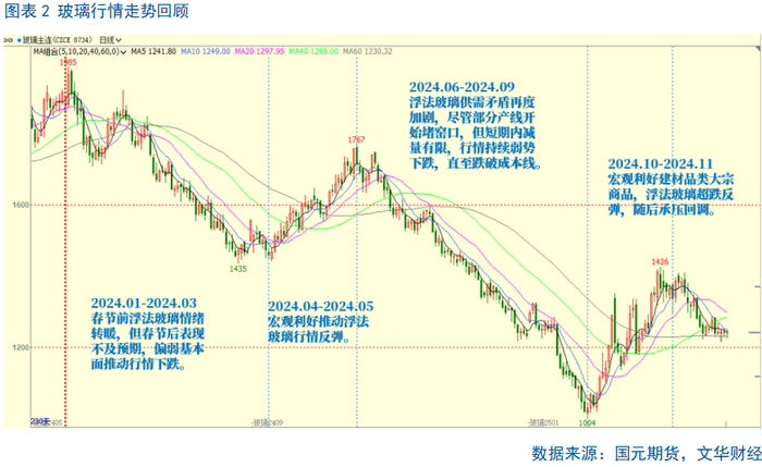 2024年,玻璃行情节奏与纯碱表现出较高的一致性,在国庆假期后走势则出现分化。整体来看,浮法玻璃价格中枢呈现下行。2024年1月-2024年3月,浮法玻璃春节前情绪转暖,但春节后表现不及预期,偏弱基本面推动行情下跌。2024年4月-2024年5月,宏观利好推动浮法玻璃行情反弹。2024年6月-2024年9月,浮法玻璃供需矛盾再度加剧,尽管部分产线开始堵窑口,但短期内减量有限,行情持续弱势下跌,直至跌破成本线。2024年10月-2024年11月,宏观利好建材品类大宗商品,浮法玻璃产销率一度破百,前期超跌的浮法玻璃强力反弹,随后承压回调。