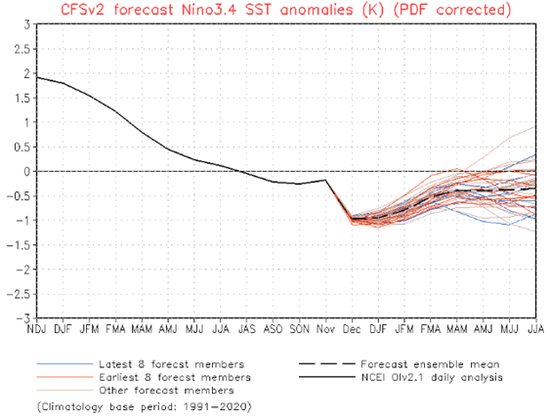 根据NOAA预测,拉尼娜现象预计持续到3月份,因此12、1月份降雨概率有所增加。从图像上来看1月份印尼、马来西亚仍有降雨,但泰国南部降雨量处于正常状态。