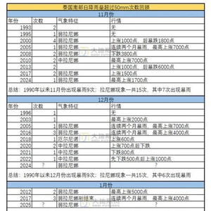对1990年以来泰国南部发生暴雨现象进行整理。根据官方定义,日降雨量大于50mm时被定义为暴雨,且容易引发洪涝灾害,因此我们整理了1990年以来泰国南部50mm以上的降雨,并对其进行复盘。